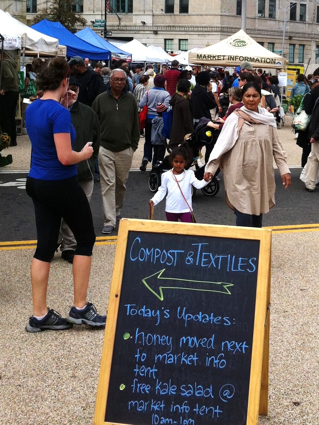 Sign directing Occupiers to Compost & Textiles. Today’s updates: honey moved to market info tent and free kale salad.