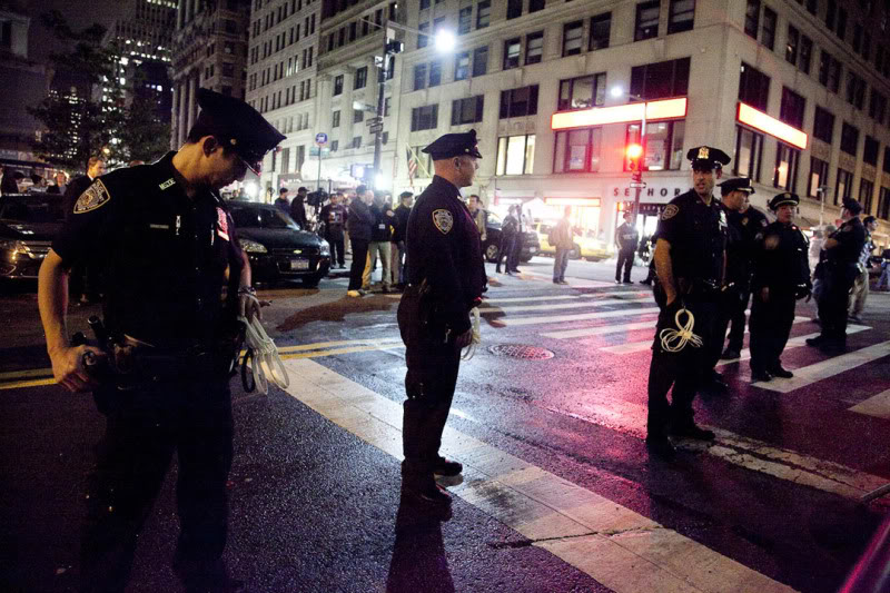Occupy looks more like Paris, 1968 in this photo – but in France, the lines of police wore helmets and dark plastic shields, looking more like space aliens – hiding their identities from their victims. (Photo credit: Frankie Norstad)
