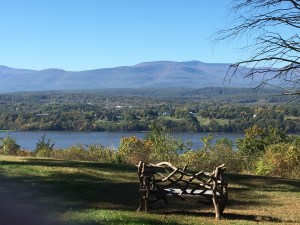 Landscape tour hike around Fredrick Church’s 300 acre property. View of the Hudson River Valley he painted, with one of many maple park benches by Olmstead. Olana State Park, NY.